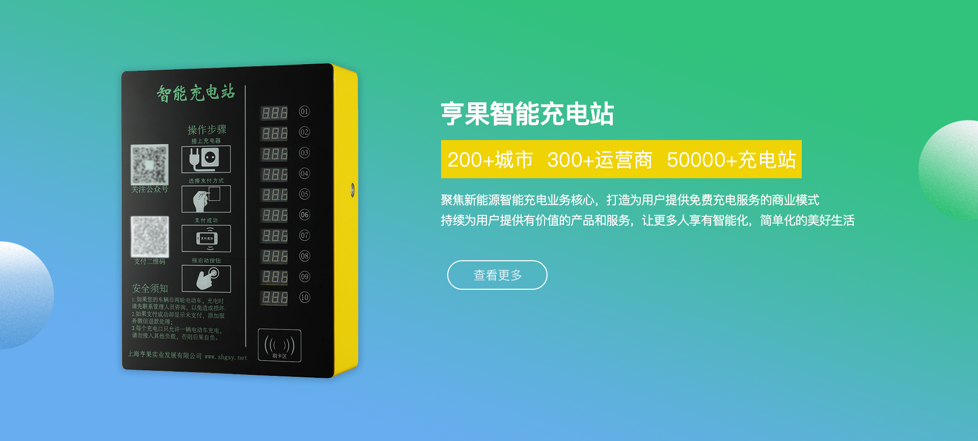 公司總部位于上海市青浦區(qū)趙巷新城經(jīng)濟開發(fā)區(qū),專注于新能源智能充電操作系統(tǒng)、智能電動車充電樁、充電樁行業(yè)運營管理平臺等多類相關 產品的研發(fā)、設計、銷售和運營,產品現(xiàn)已廣泛應用于國內各城市居民社區(qū)、高校、及商業(yè)綜合體車輛聚集區(qū)域及市政配套領域。